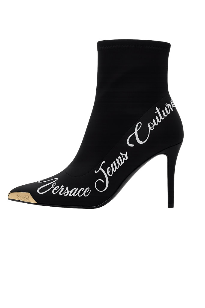Et cette saison, la marque frappe fort avec ce modèle de bottine noire à talon aiguille, véritable déclaration de style. Confectionnée dans un tissu stretch qui épouse parfaitement la cheville, cette chaussure incarne l’élégance contemporaine. La signature Versace Jeans Couture, apposée en lettrage calligraphié blanc, sublime la silhouette de la bottine avec un contraste visuel aussi chic que percutant.
